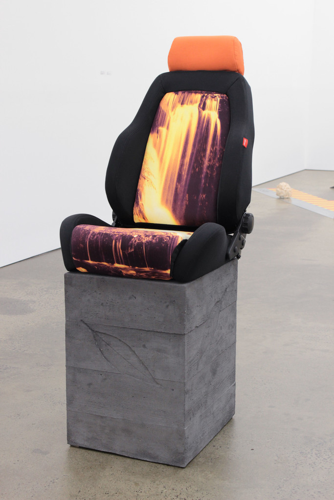 Burchill/McCamley, Falling Water (2), 2015, Cement, dye print on fabric, car seat, 143 x 94 x 55 cm