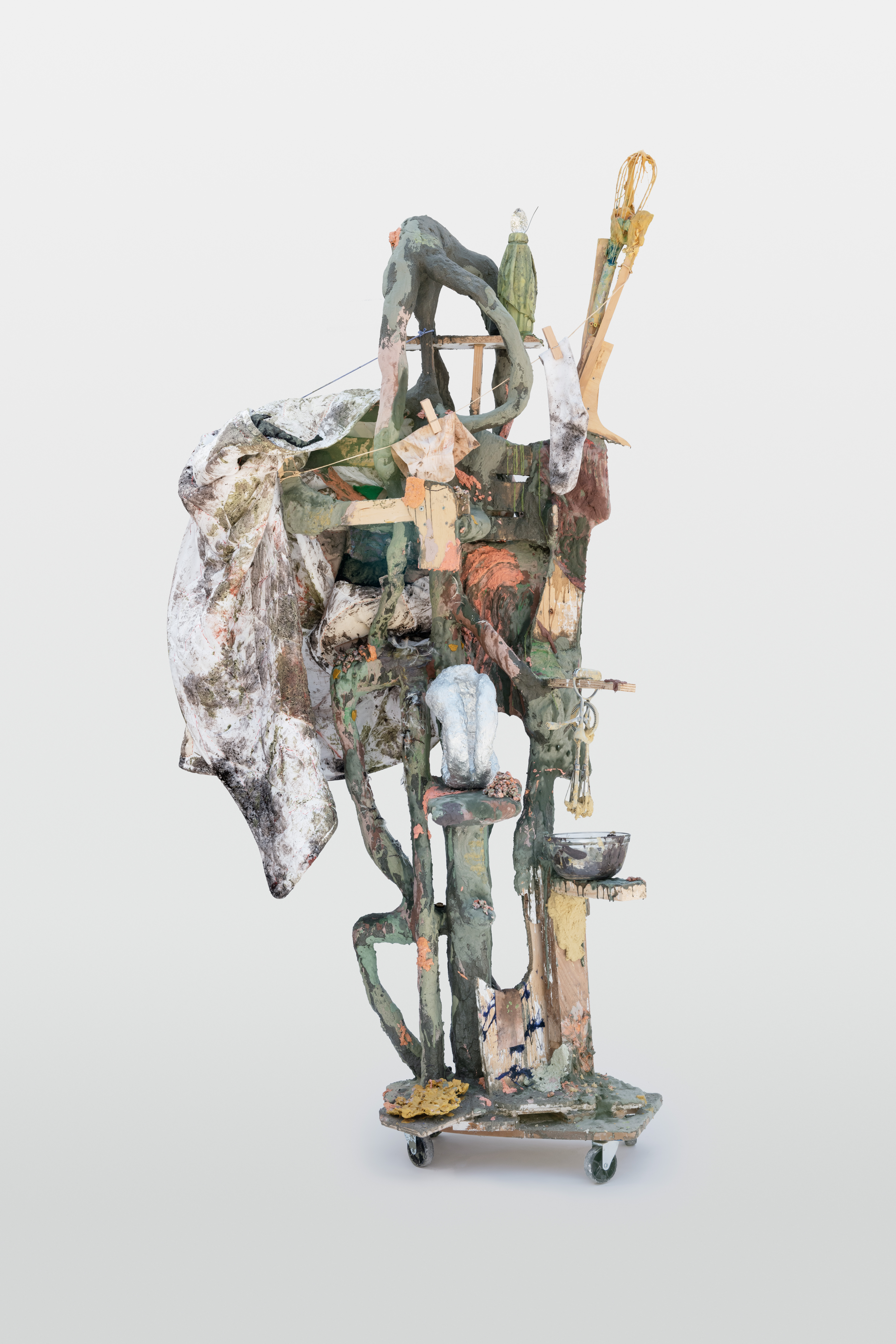 Nabilah Nordin, 'Moles and Warts', 2020. Wood, plaster bandage, plaster, broom, mover’s dolly, chicken wire, polyurethane foam, metal spoon, 158 x 101 x 60 cm.