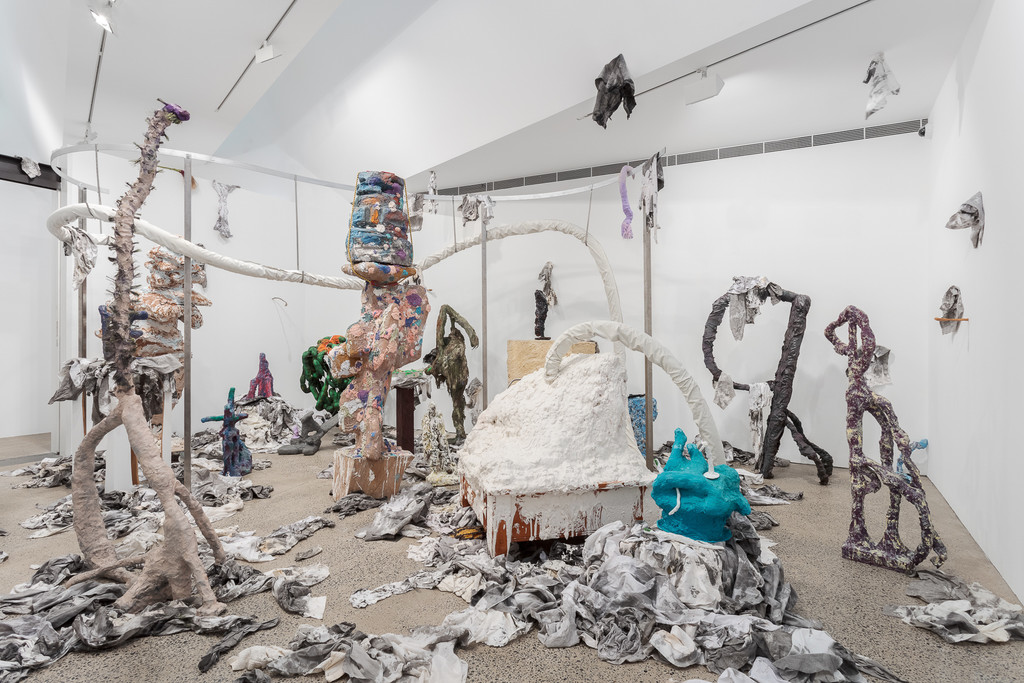 Nabilah Nordin, 'Smudging Day', 2020. Rickety wood structure (old bed frame), hand sewn doona, cement, sand, smashed-on paper pulp, bonding and sealing agent, crispy play dough, cement based cornflakes, feathers (from feather duster), ‘sample pot’ house paints, plaster and paper porridge pie, egg beater, glass mixing bowl, bottom of bucket leftovers (replica Nerds clumps), pillow insides, old collar shirt/rag, wooden pegs, muddy sock, rope, plaster bandage, screws, soil and sealer paste, polyurethane foam, chrome silver spray paint, chicken wire, miscellaneous filth (snot?), mover’s dolly, spoon, aluminium foil, wire, old milk bottle, bald cap with green gunk applied, rubber band, whisk with curdled hair and jute twine, 212 x 115 x 70 cm. Documentation by Simon Strong.
