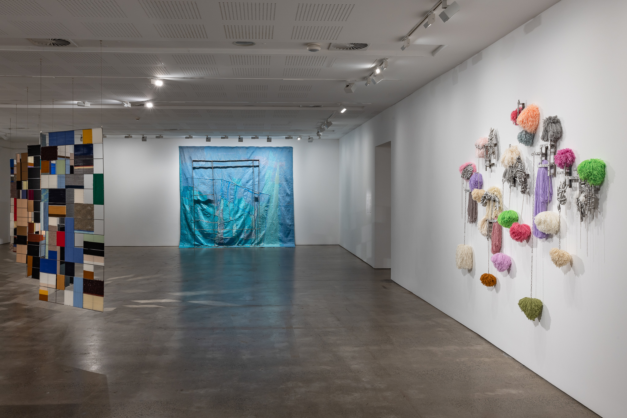 Teelah George, 'Sky Piece, falling (Melbourne, Perth)', 2020-2021. Installation view, 'Pliable Planes: Expanded Textiles and Fibre Practices', UNSW Galleries, Sydney, 2022.