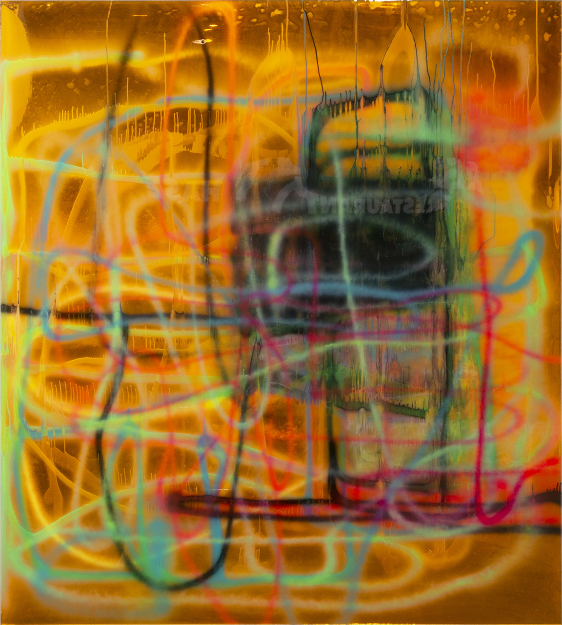 Spray paint markers and spray paint and Epoxyglass on perspex,