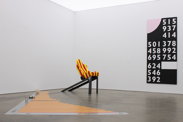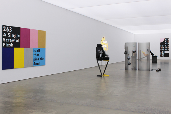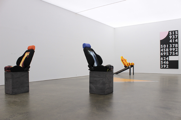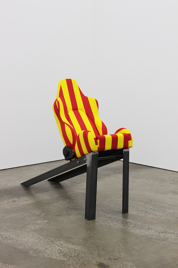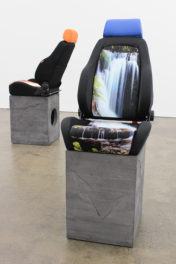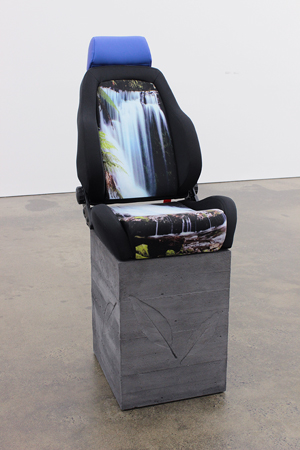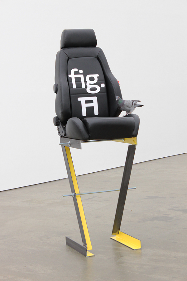 Synthetic polymer paint on leatherette car seat, taxidermy pigeon, enamel on steel,