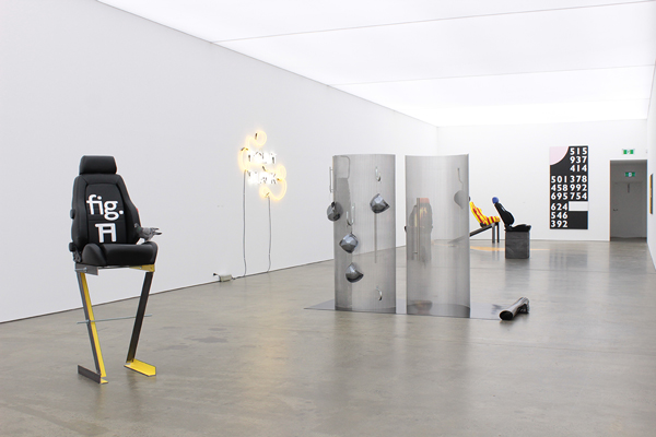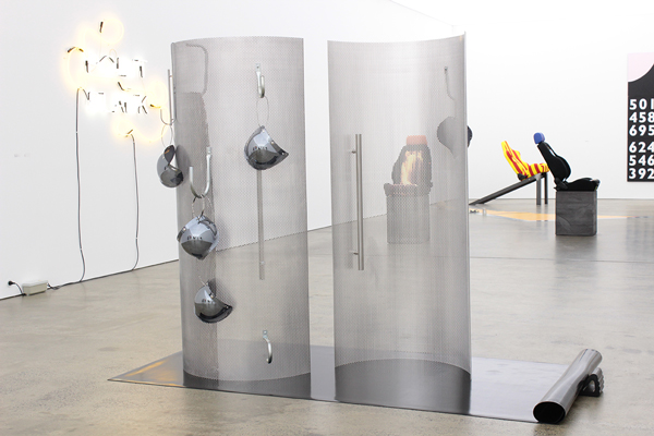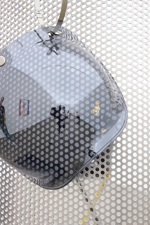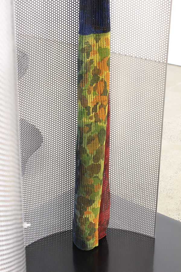 Perforated aluminium, stainless steel, mirrored Perspex, rubber,