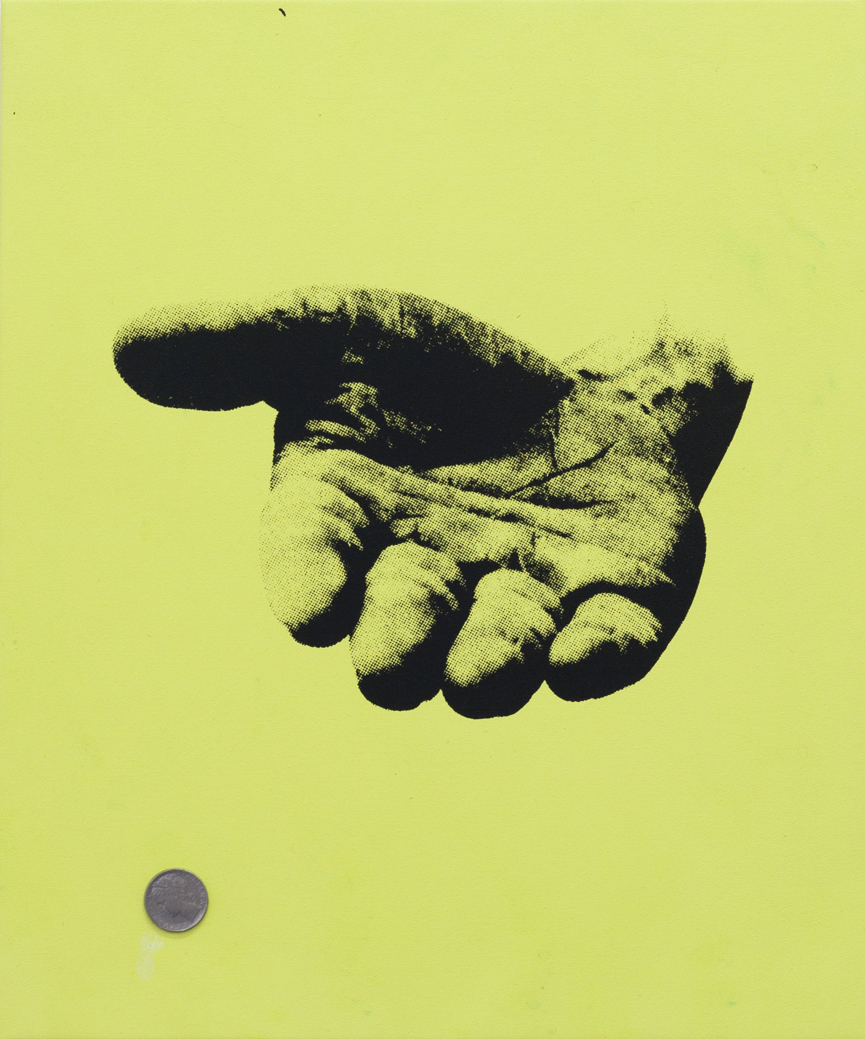 Janet Burchill, From hand to mouth, 1991, SP ink and coin on acrylic on canvas, 45.5 x 35 cm