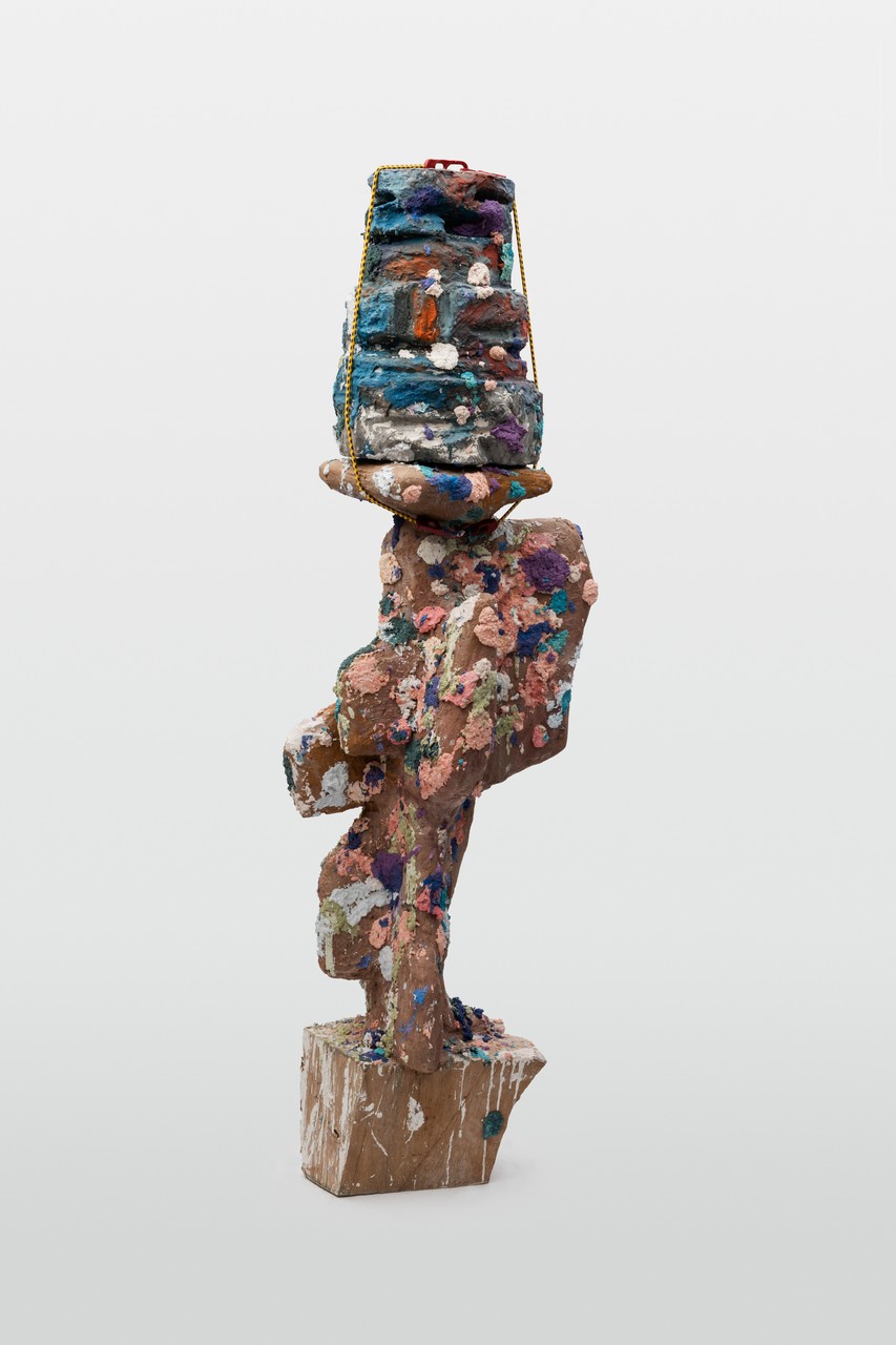 Wood, foam board, chicken wire, plaster bandage, cement, sand, sealant, acrylic paint, house paint, paper mix, polystyrene, strap, epoxy resin, sand, polyurethane pigments