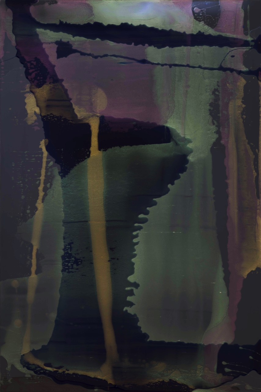 *After leaving Belmont Boys High School Lionel had a corpus cavernous and corpus spongiosum procedure done so he could play professionally for the Lake Macquarie Dockers AFL 5*, 2020, colour shift pour acrylic, Epoxyglass, on perspex, 150 x 100 cm.