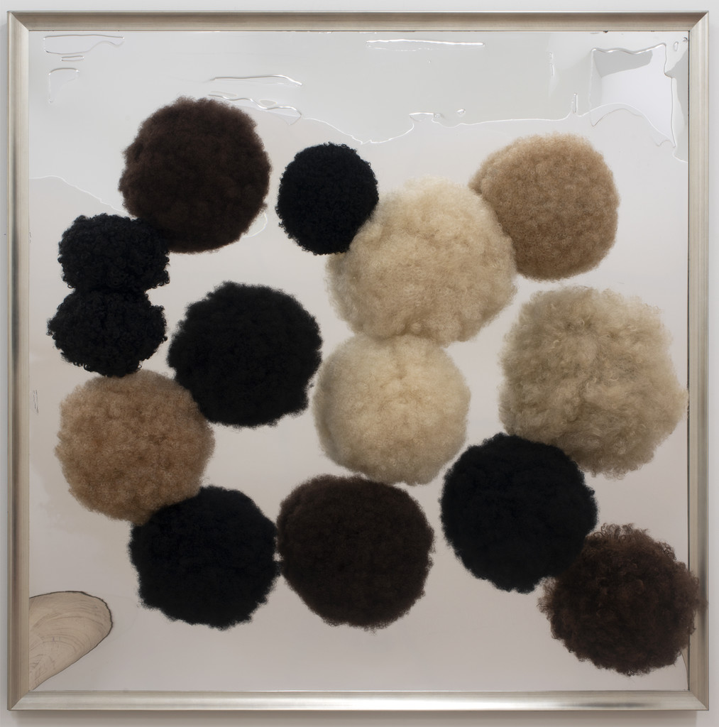 Afro wigs on foam heads, epoxyglass, on perspex, 200 x 200 cm