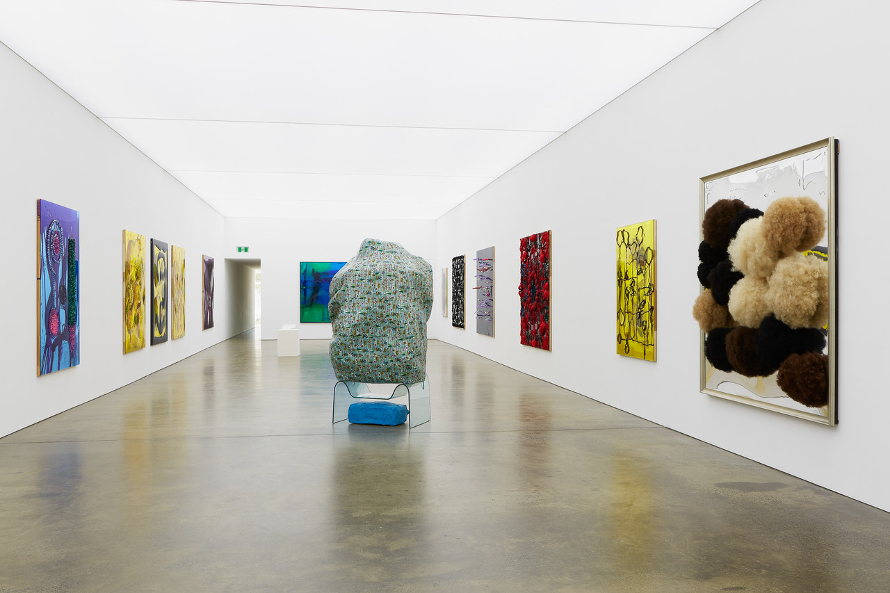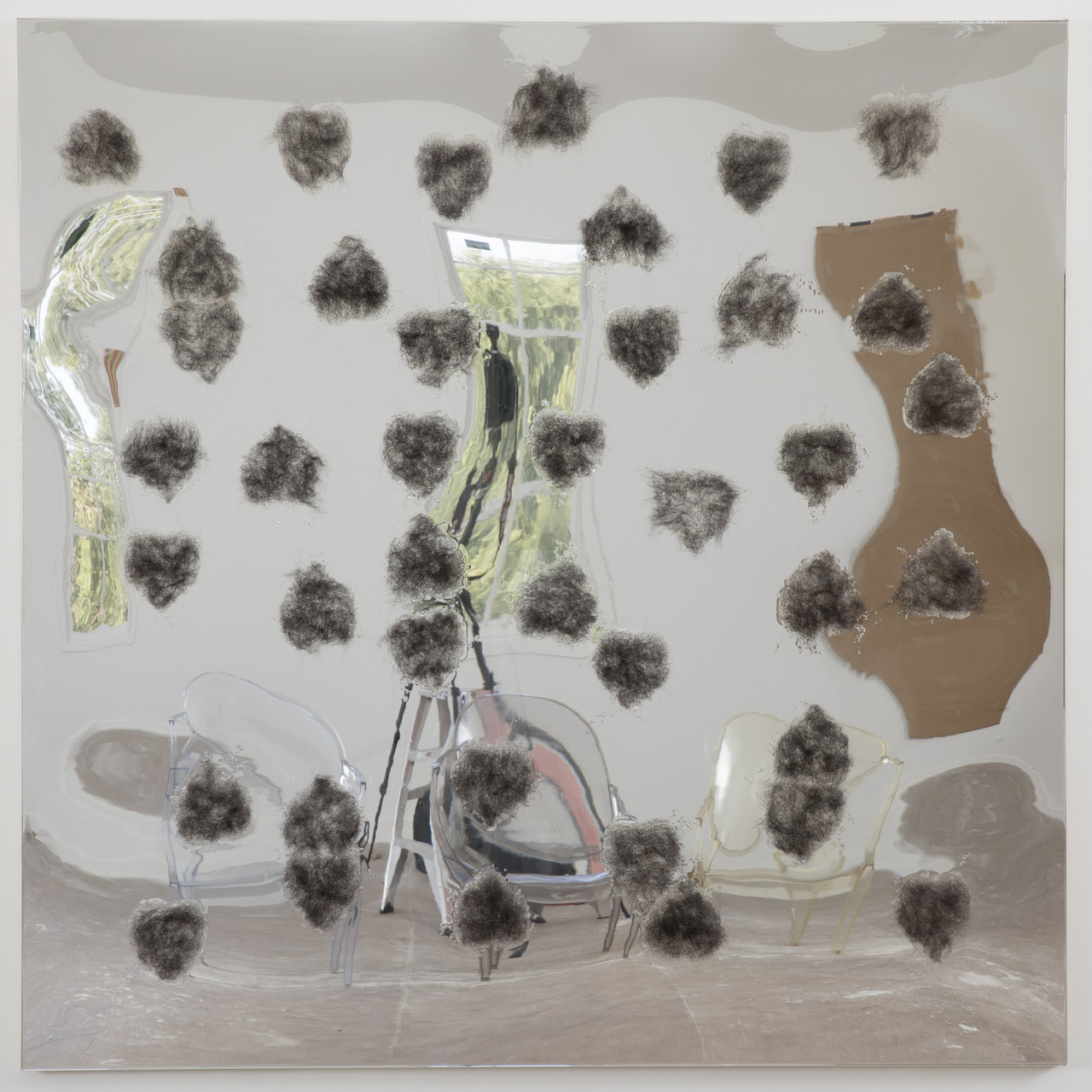 Dale Frank, Chris the studio assistant was often stripping off naked and photographing himself in this painting, 2016, Chinese mens glue on chest hair wigs sourced from Greece, epoxyglass, on perspex, 200 x 200 cm