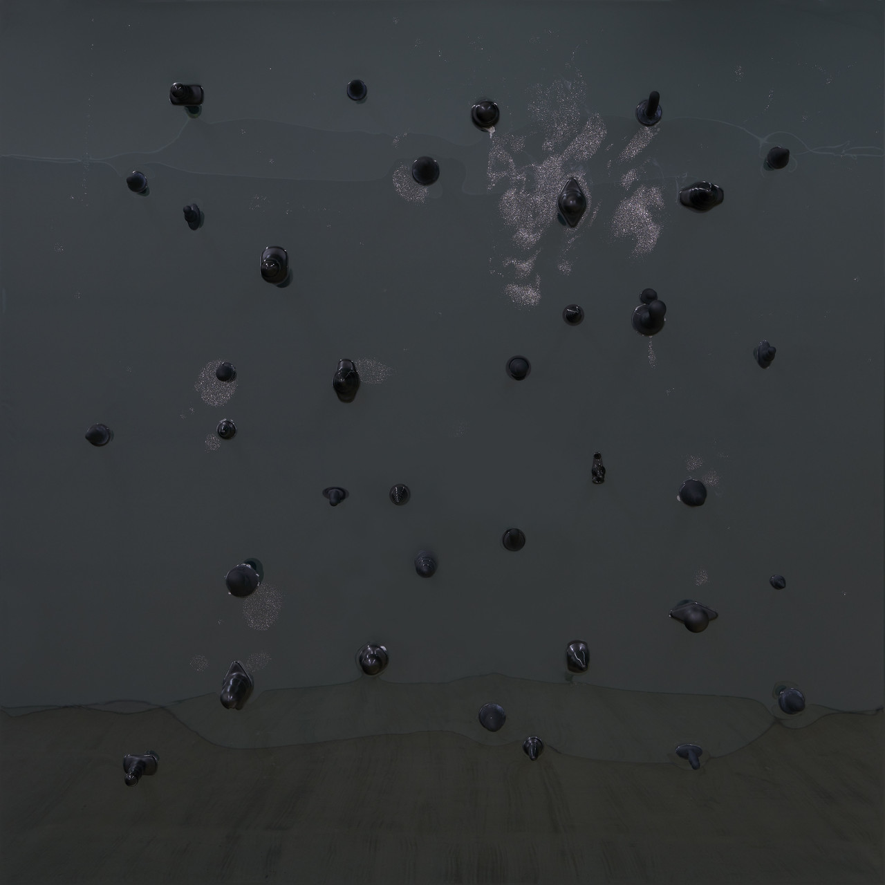 Dale Frank, View over Lagos, 2019, Black silicon and glass anal plugs, glitter, epoxyglass on perspex, 200 x 200 cm
