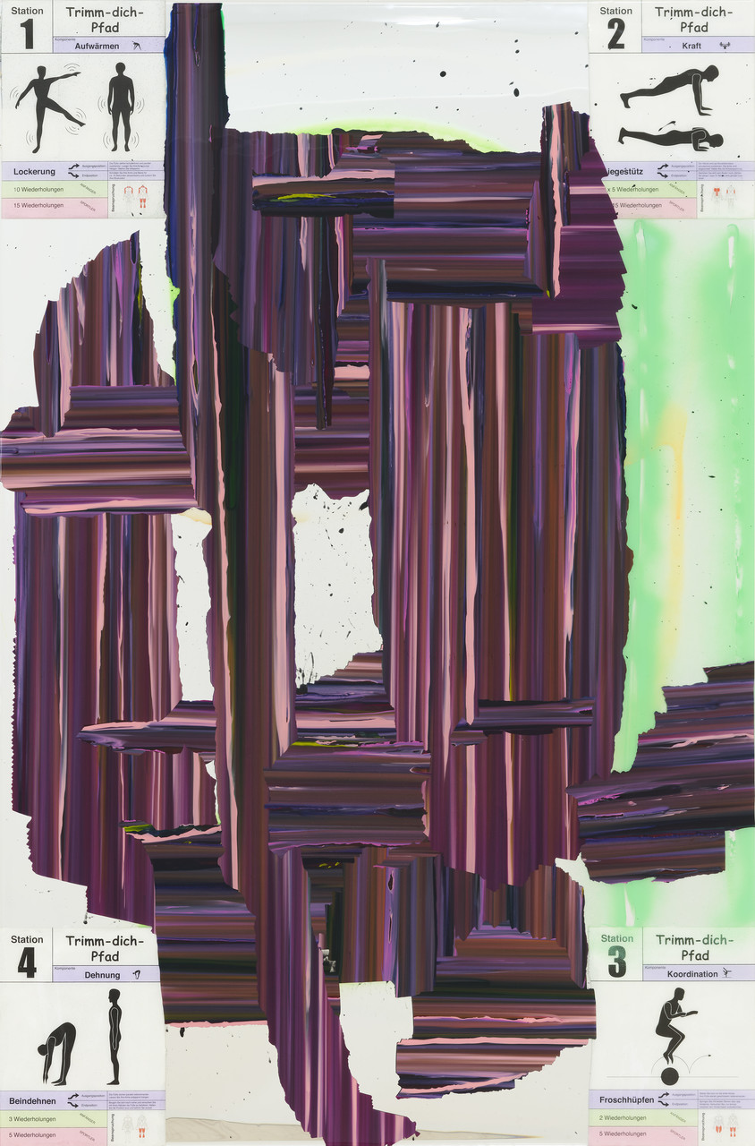 Dale Frank, Hands and Boners Club Cologne, 2019, Collage, printed pages, spray acrylic, peeled varnish paint, epoxyglass on perspex, 150 x 100 cm