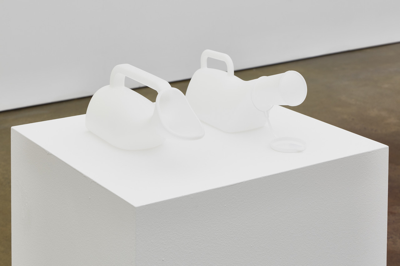 Dale Frank, Fountain, April 17 2017, 2019, Machine moulded white plastic invalid urinal bedpans male and female on white plinth, 13.5 x 30 x 33 cm