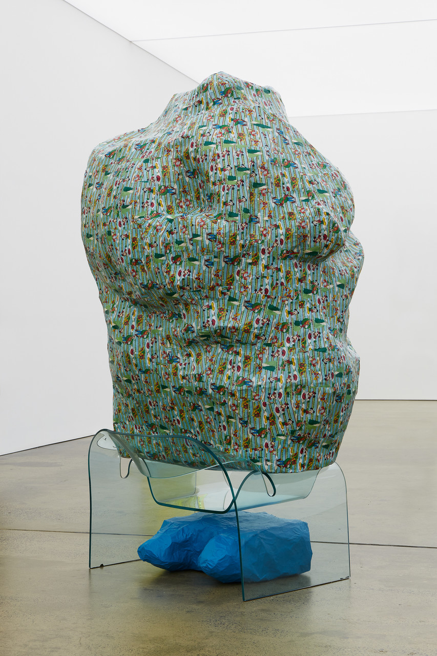 Dale Frank, The very good falafel and the really naughty falafel making love in the back of a caprice, 2019, Film glass chair, wrapping paper, paper-mache wire frame, 204 x 102 x 97 cm