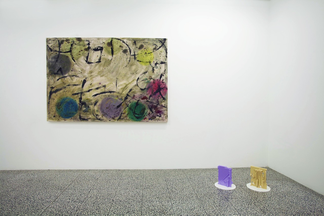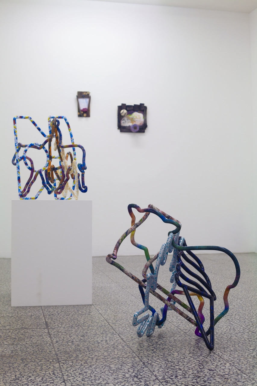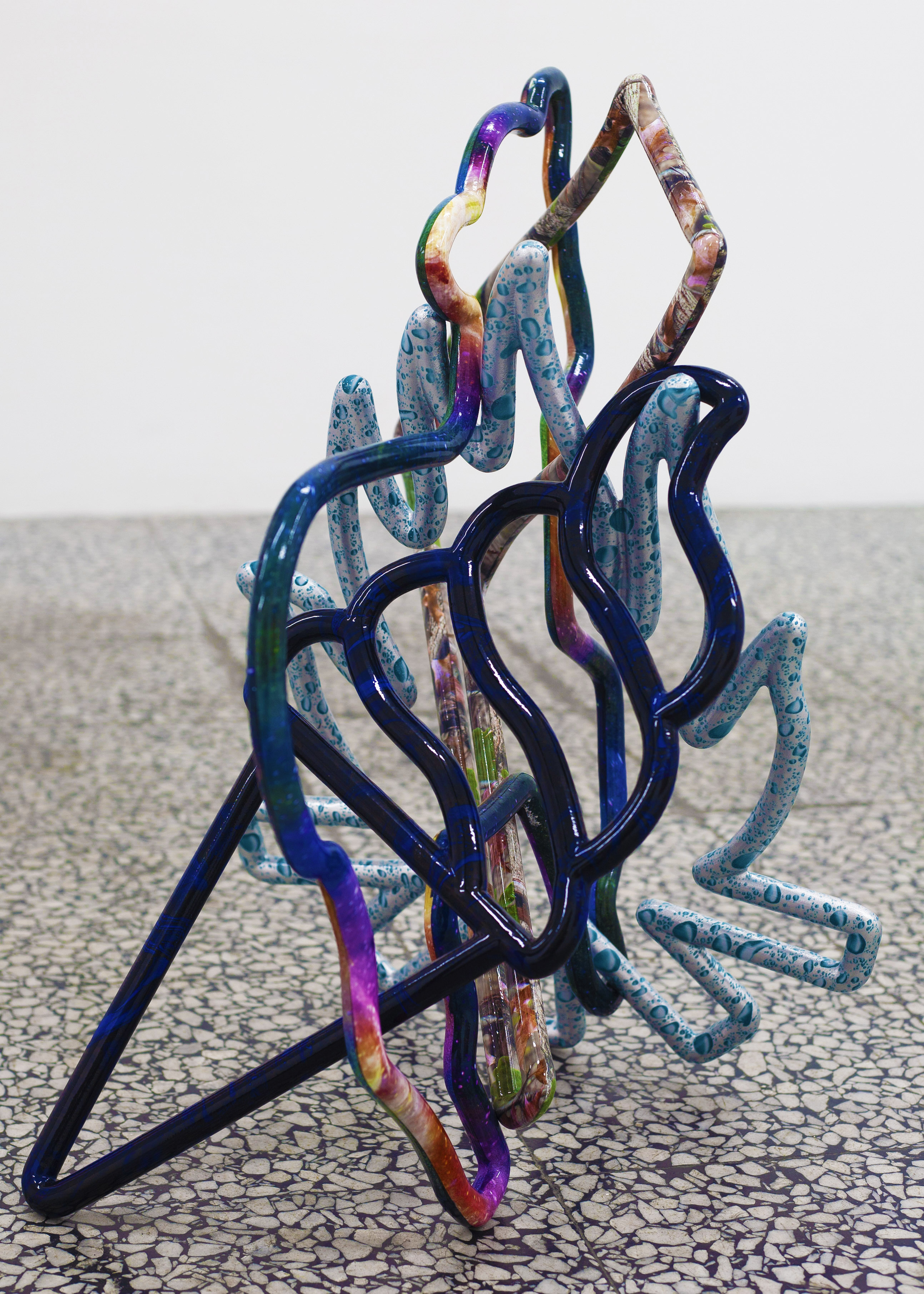 Yolunda Hickman, *Thickets (galaxylambwetfirepythonicecreamforestflag)*, 2021, lacquer, polyvinyl alcohol print, wood, four components, 59.5 x 48 x 57 cm.