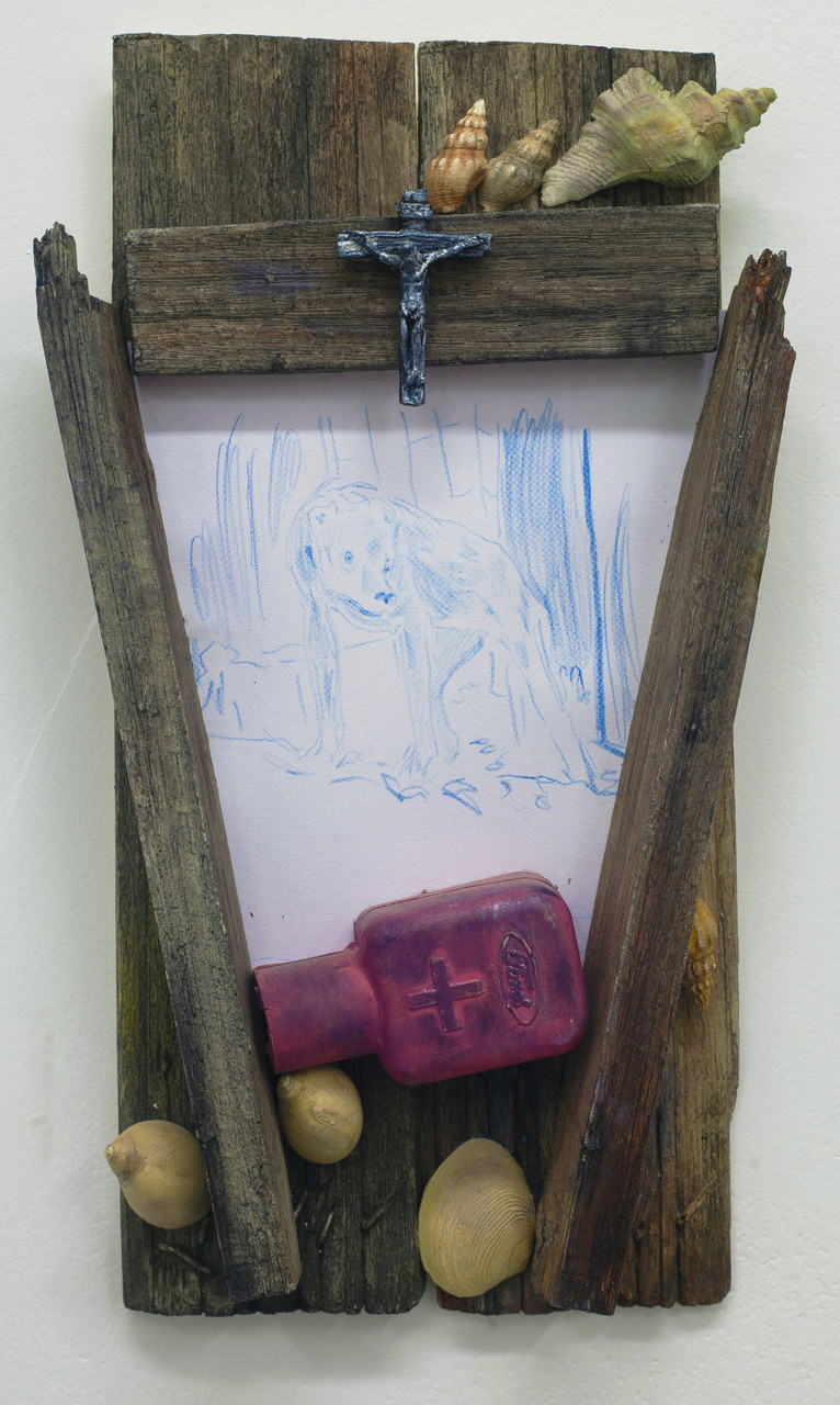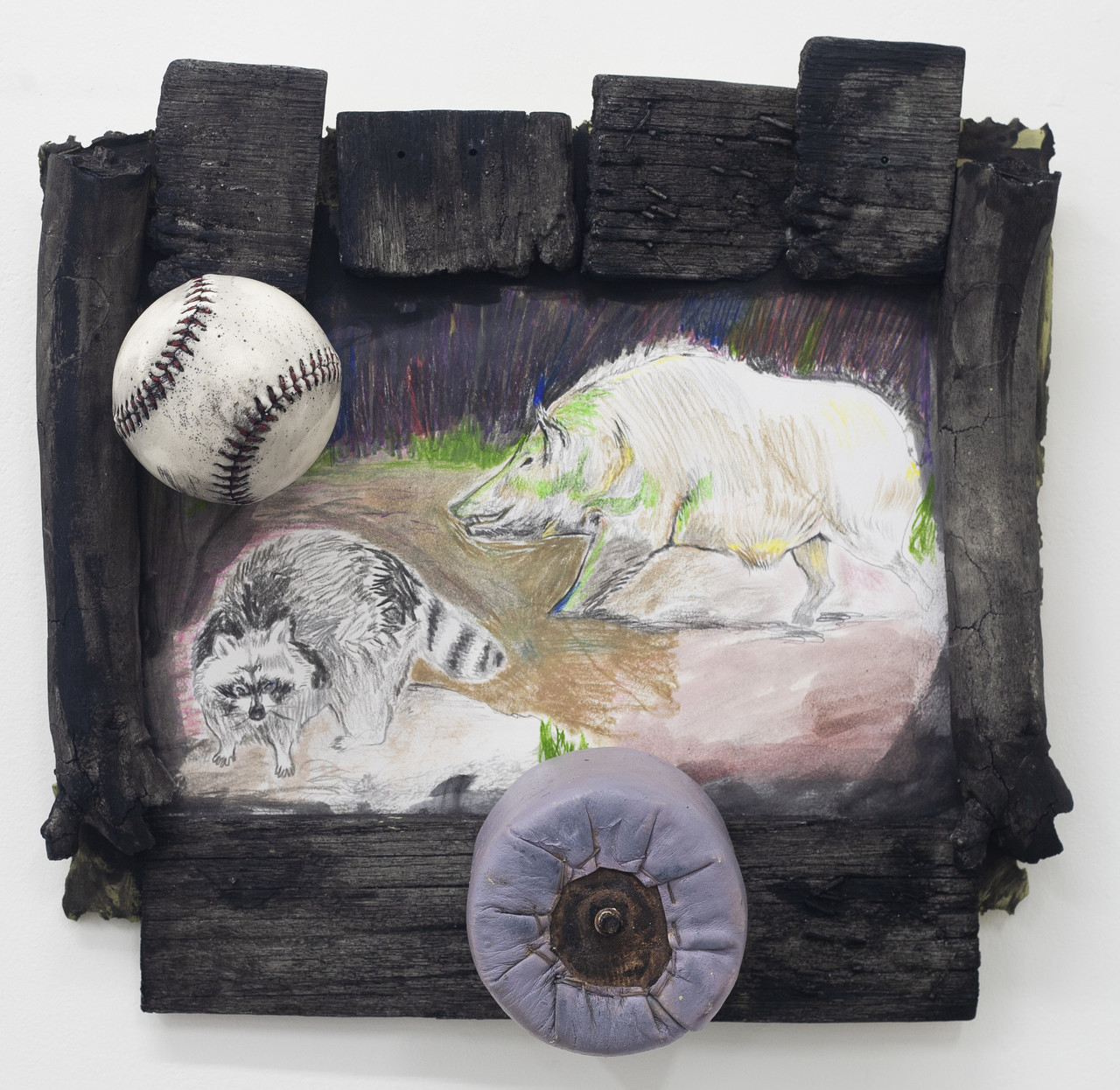 Billy Coulthurst, *Badger and Boar*, 2021, Resin, paper, pencil, acrylic, 32 x 34.3 cm.