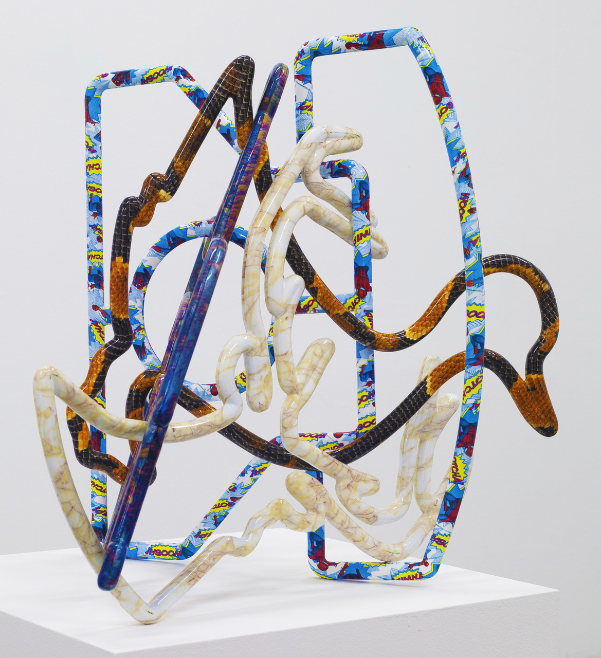 Yolunda Hickman, *Thickets (marblestagspidermantelephoneoilslickhorseriderorangeboaduck)*, 2021, polyvinyl alcohol, lacquer on wood, 57 x 57 x 54 cm.