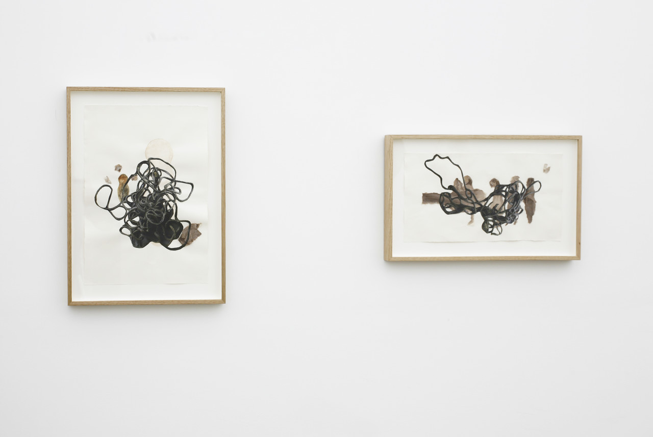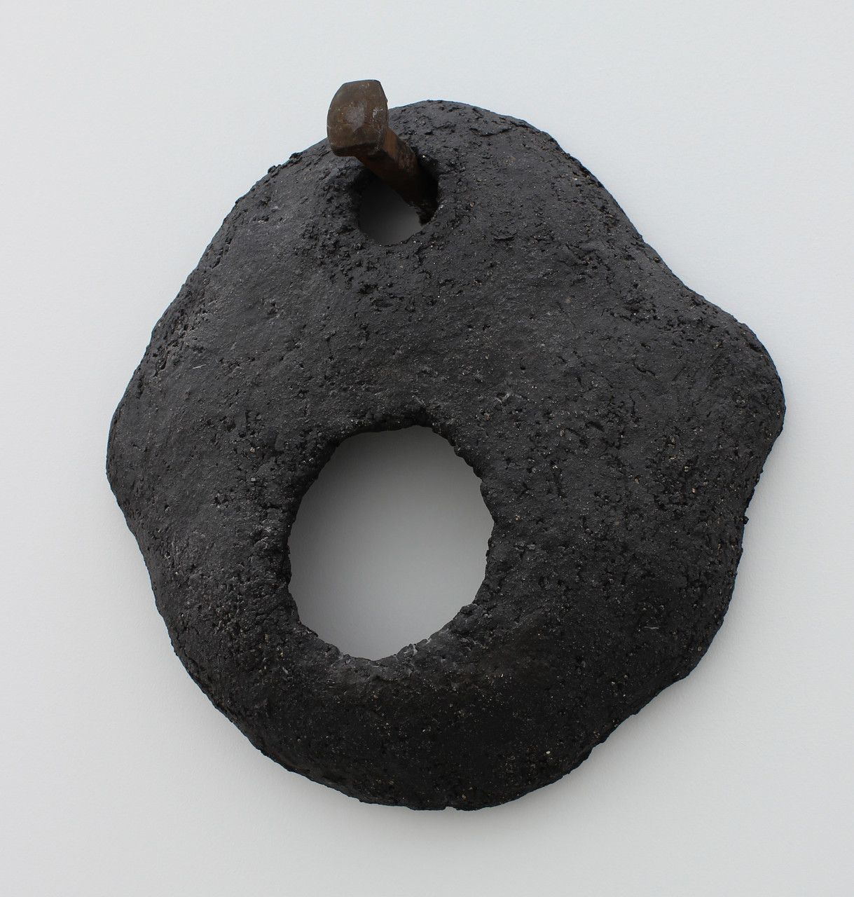 Naomi Eller, Two-hole single weight I, 2018, Black clay, wax, 40 x 39 x 8 cm (Irregular)