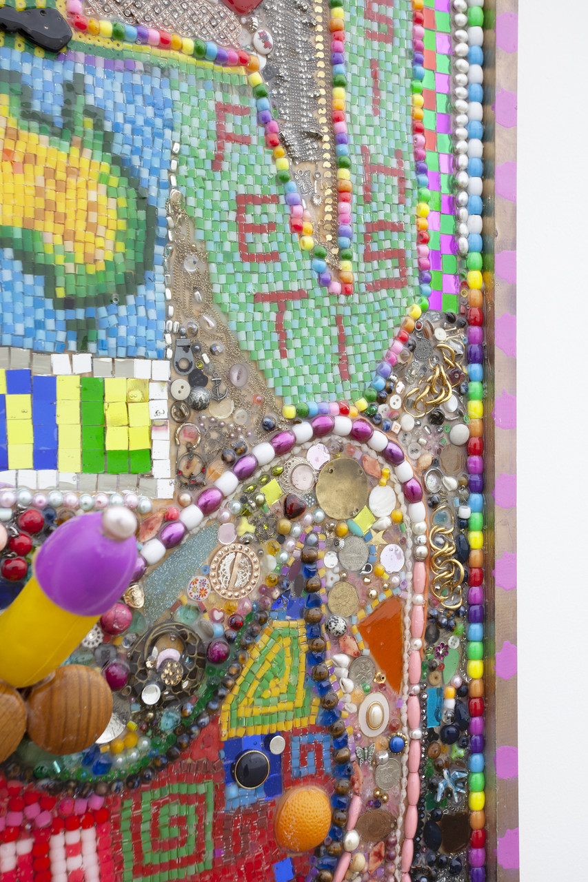Mixed media assemblage, found objects, buttons, toys, shells, china plate, mirror, collage, beads, coins, jewelry, nail polish, acrylic, enamel, house paint and resin on wood,