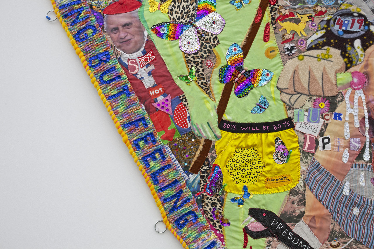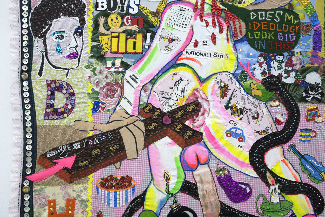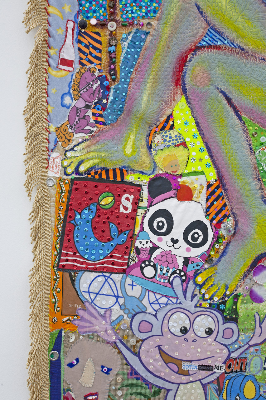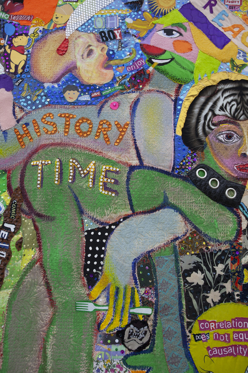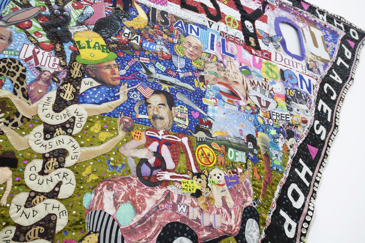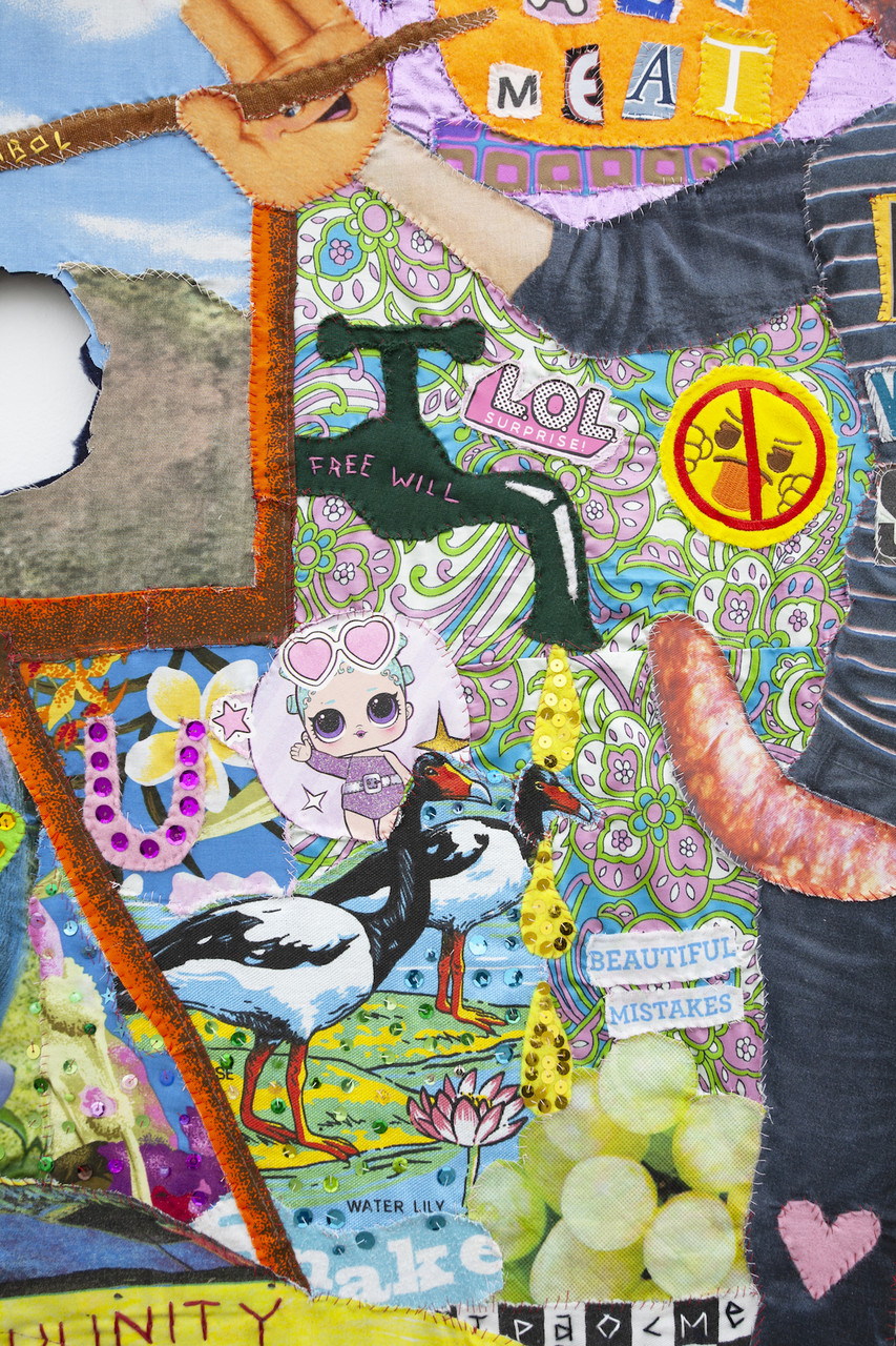 mixed media applique textile comprising found objects, reclaimed fabrics, beads, sequins, quilting thread, buttons, eyelets,