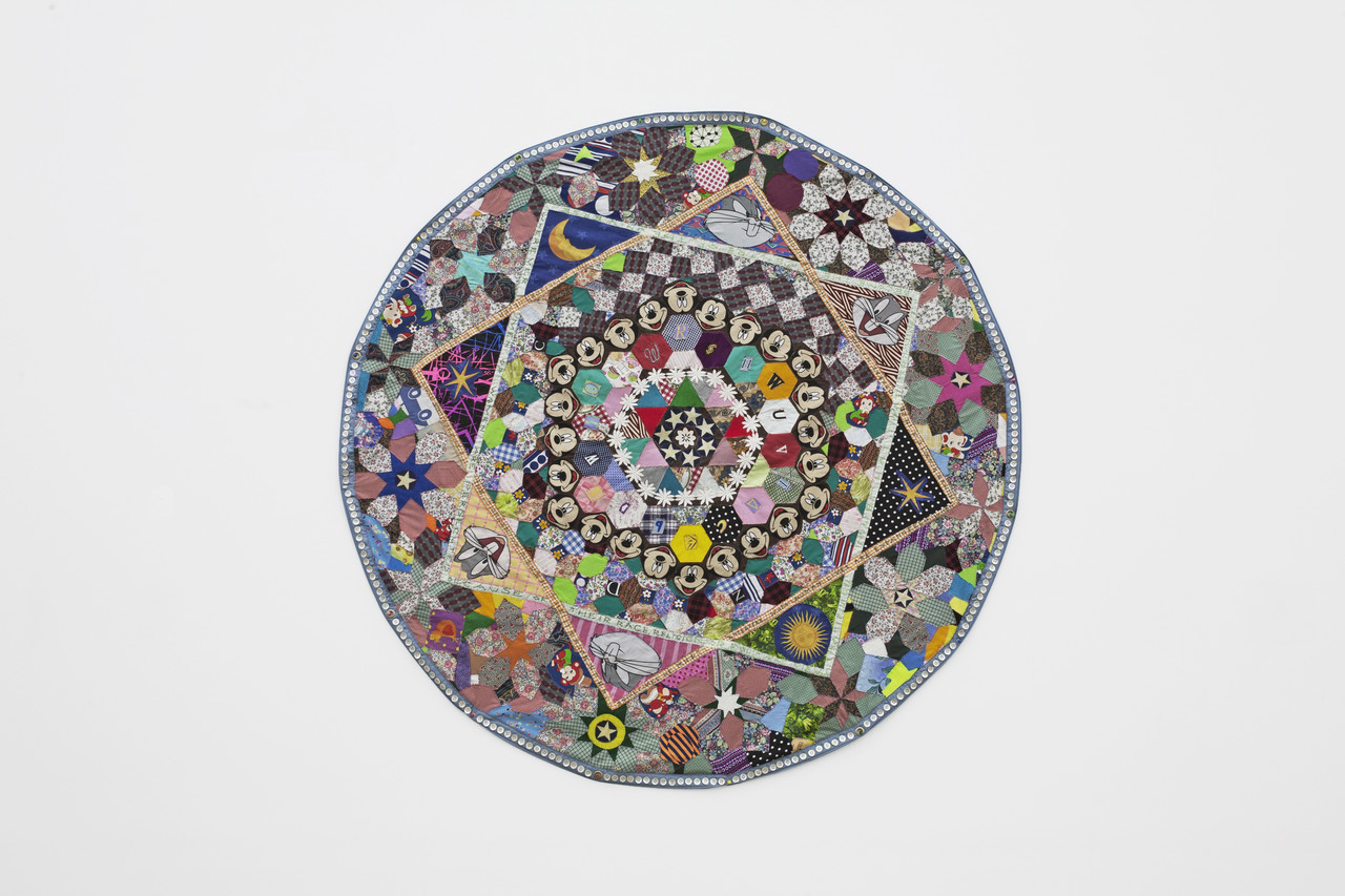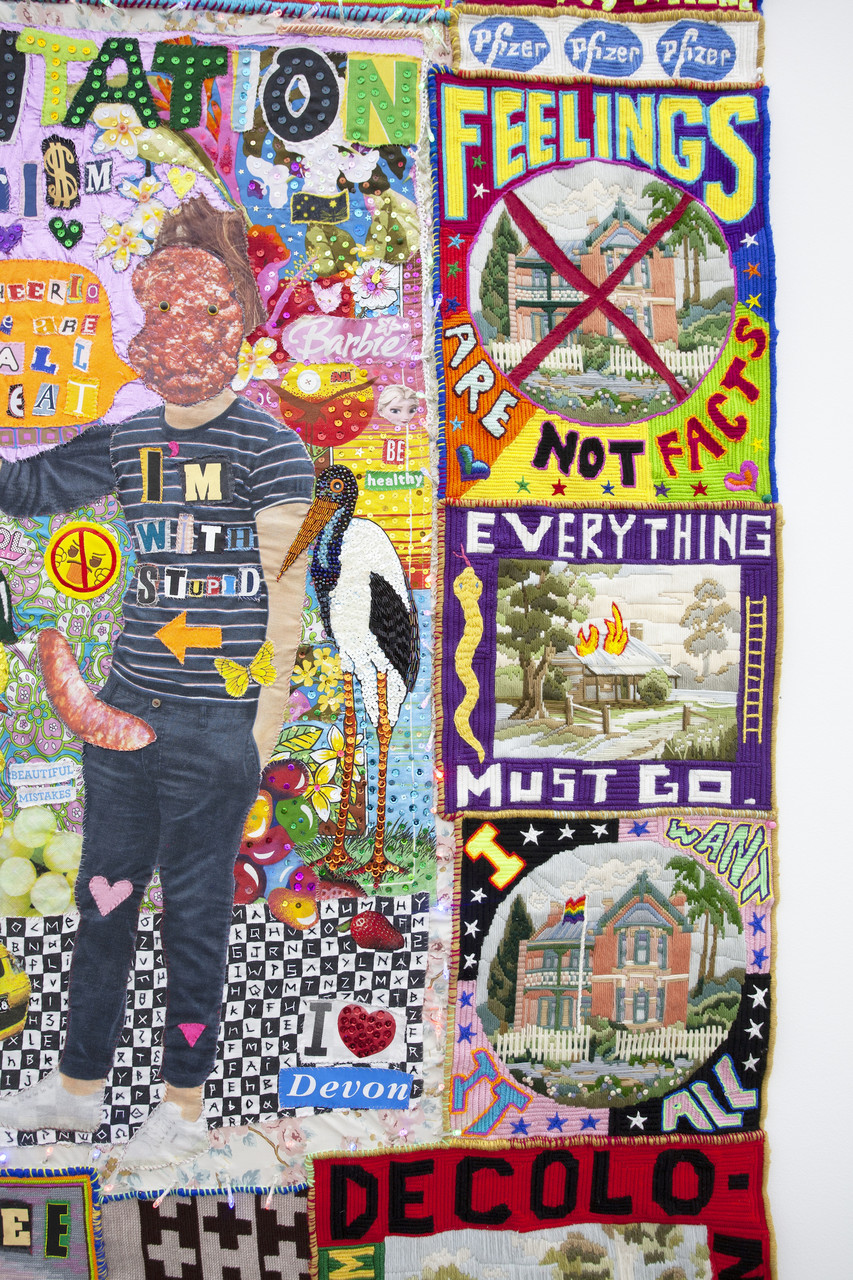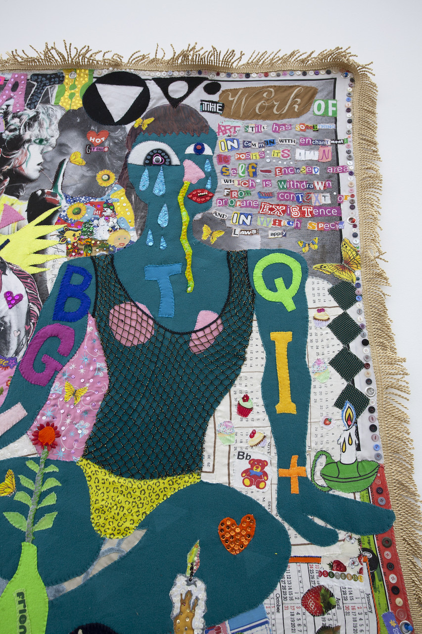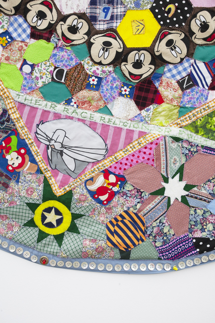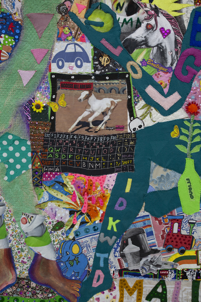 mixed media applique textile comprising found objects, reclaimed fabrics, beads, sequins, quilting thread, buttons, eyelets,