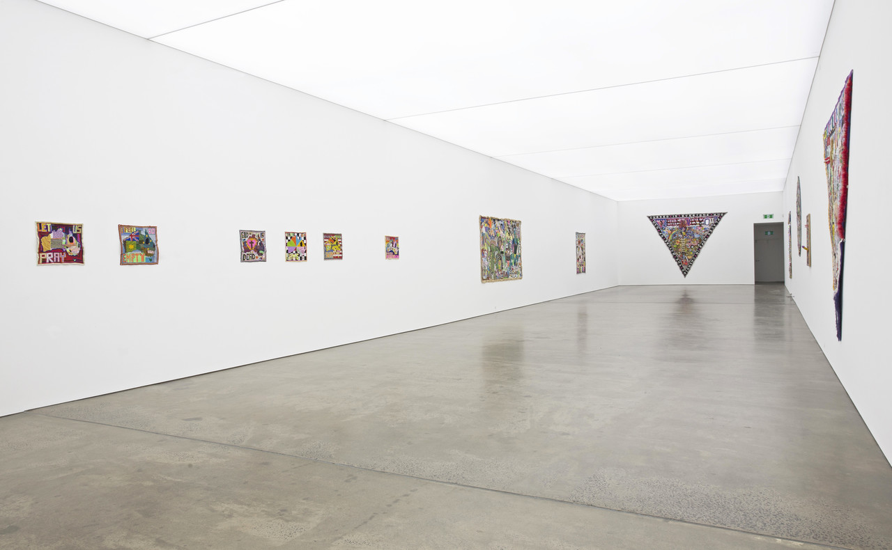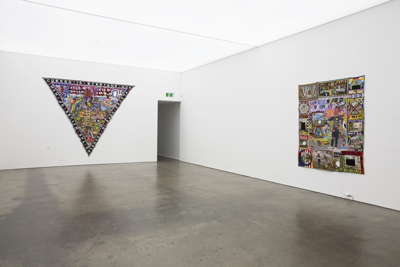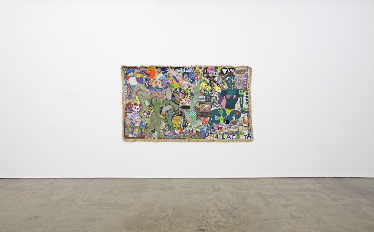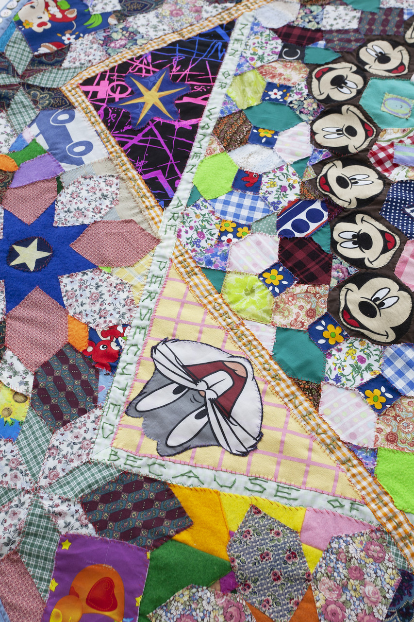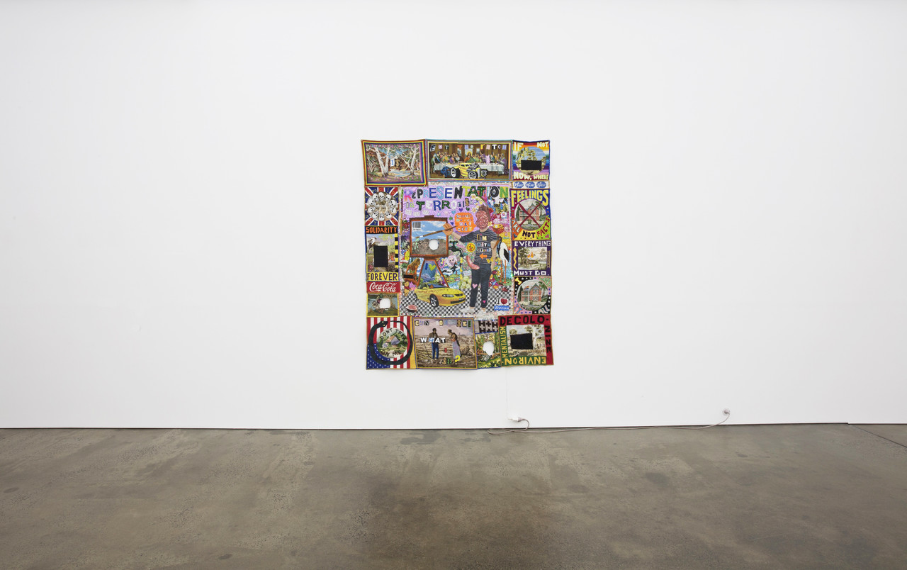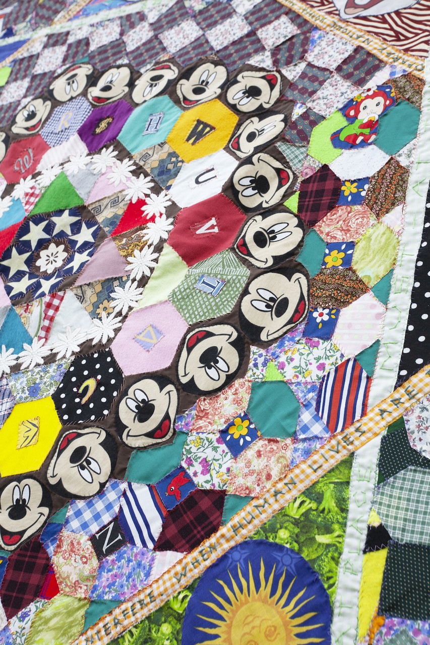 mixed media applique textile comprising found objects, reclaimed fabrics, beads, sequins, quilting thread, buttons, eyelets,