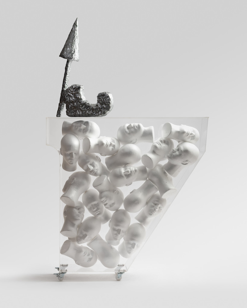 Nabilah Nordin, 'The Elves of Whistletown', 2022. Wood, foam, epoxy modelling compound, spray paint, acrylic sheeting, foam mannequin heads, castors, 200 x 120 x 26 cm.