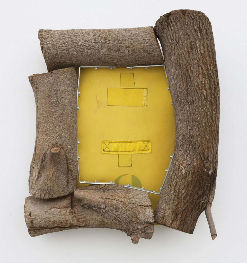 Found synthetic fabric, timber, metal,