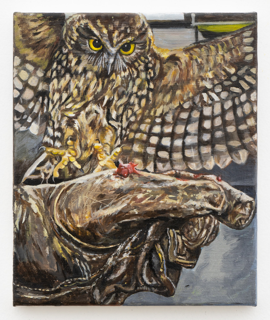 Rea Burton, 'Morepork', 2022. Acrylic and oil on linen, 30 x 25 cm.