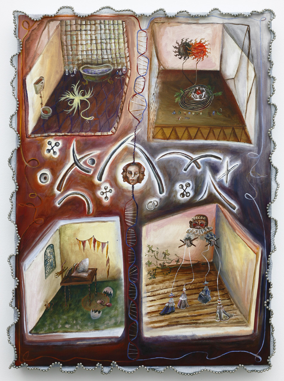 Matilda Davis, Four rooms for fours own, 2019, Oil on canvas, synthetic trim, 50 x 40 cm